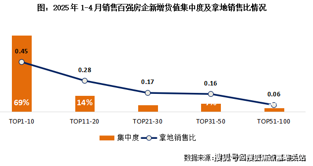 2025年1-4月发卖百强房企拿地集中度仍然维持高位,发卖TOP10房企新增货值占发卖百强新增货量的69%?